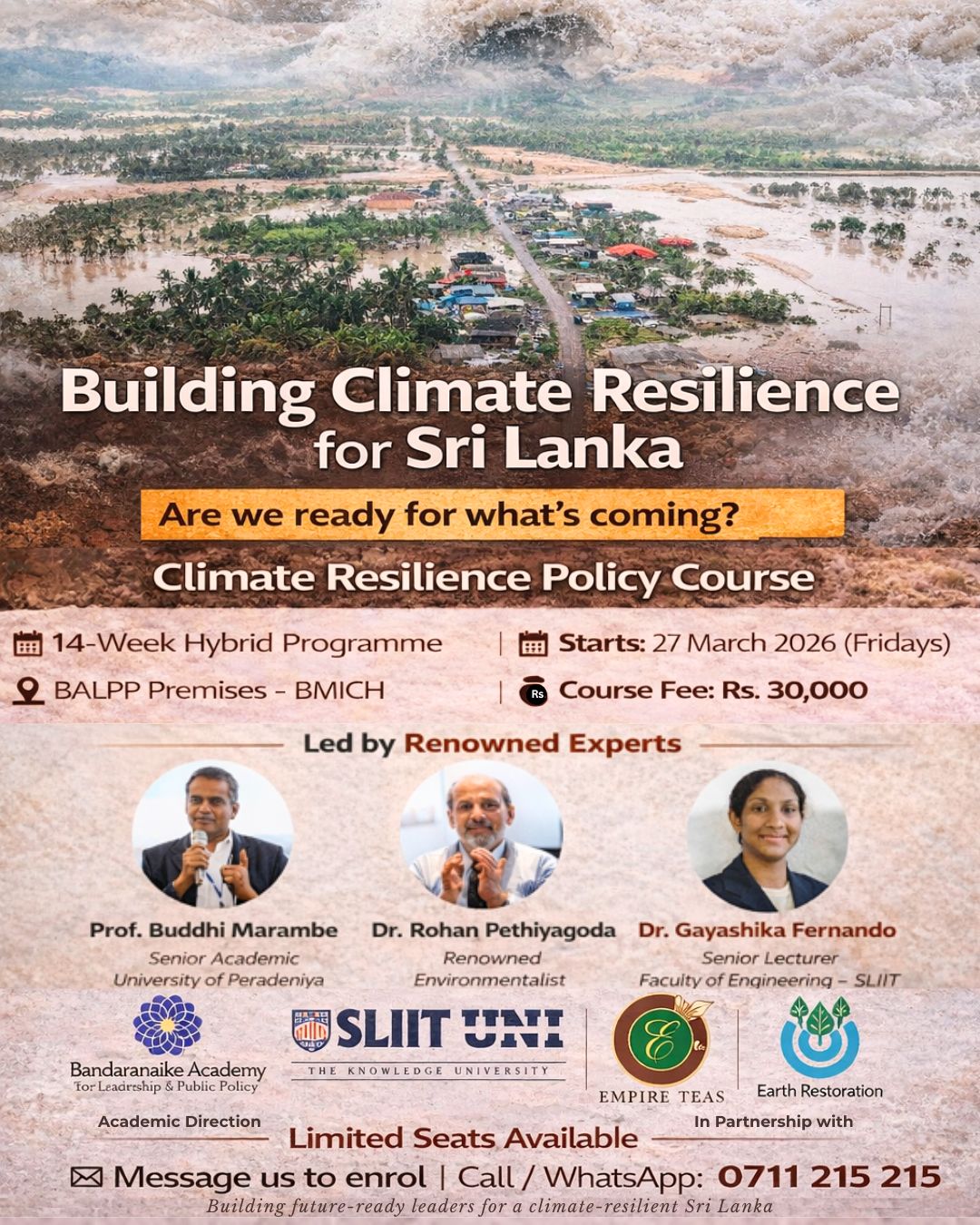 Developed as the first structured climate resilience policy programme in Sri Lanka, the course brings together climate science, public policy, governance, and development planning to help participants understand how climate risks intersect with economic stability, social vulnerability, and institutional decision-making in the Sri Lankan context. Whether you are an environmental practitioner, policymaker, development professional, student, or simply seeking a deeper grasp of climate-related challenges, the programme offers grounded insights into climate adaptation, resilience planning, and evidence-based policy responses, making it a timely and relevant learning opportunity for anyone engaged in shaping Sri Lanka’s climate future.