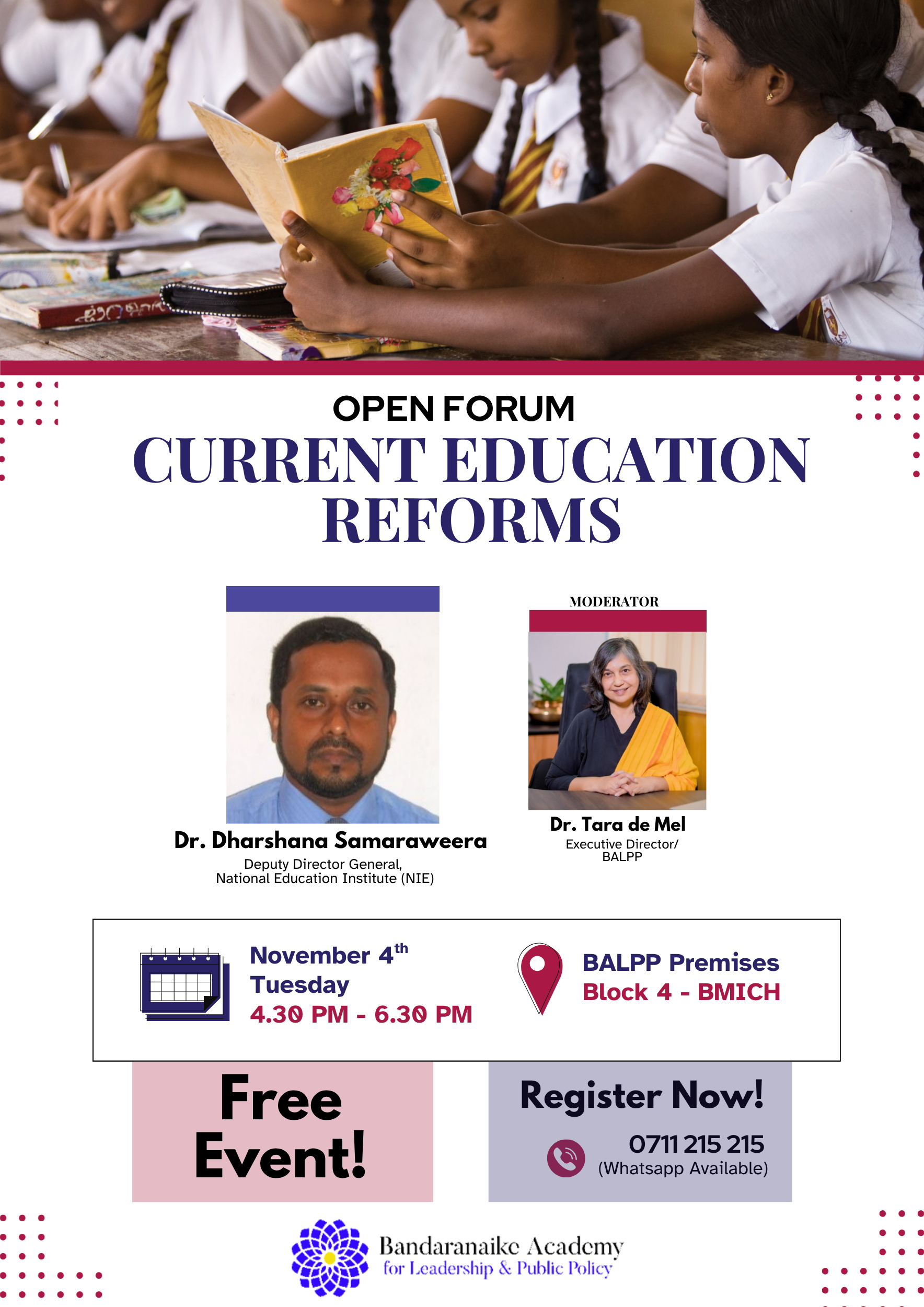 The Bandaranaike Academy for Leadership and Public Policy (BALPP) convened an open discussion on Sri Lanka’s ongoing education reforms on November 4th at the BMICH. The event brought together educators, academics, administrators, and professionals from government, corporate, and non-governmental sectors to engage in a constructive and evidence-based dialogue on the future of education in the country.